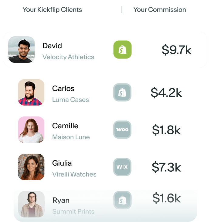 Implementa Kickflip para tus clientes y gestiona la configuración, la relación y el éxito continuo, manteniendo el 100 % de tus ingresos por implementación. También puedes compartir enlaces de referencia y ganar comisiones por nuevos registros.